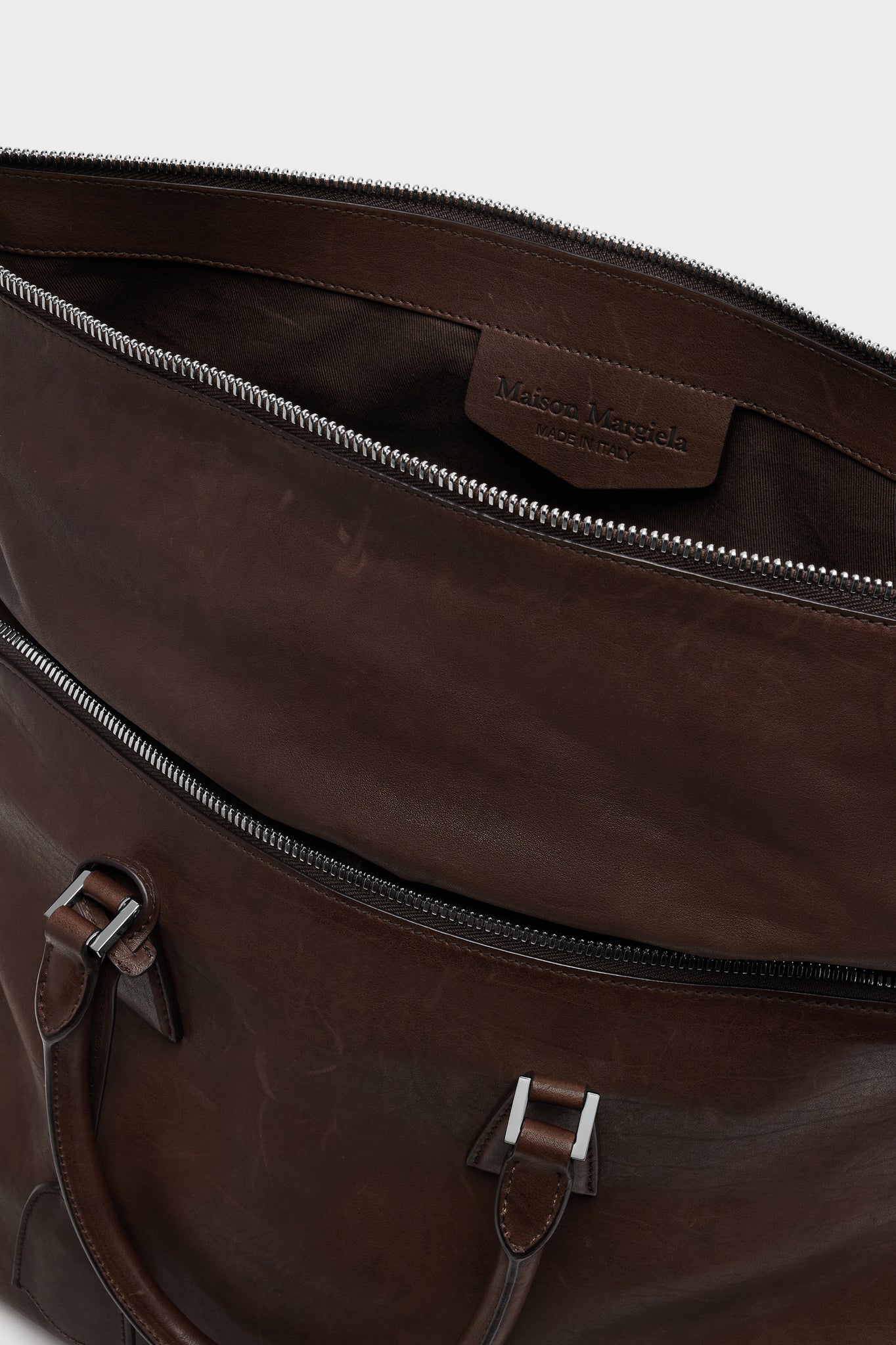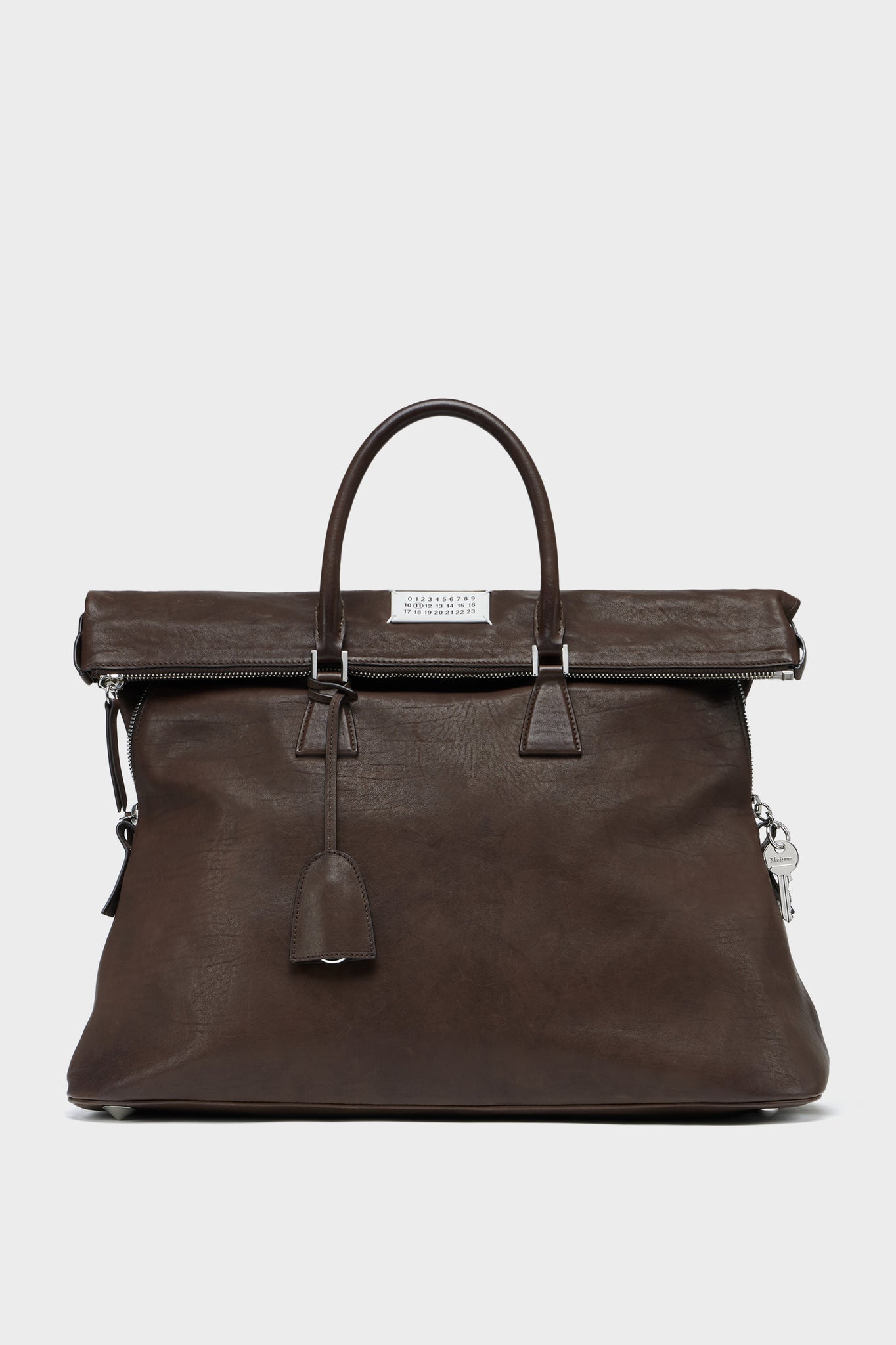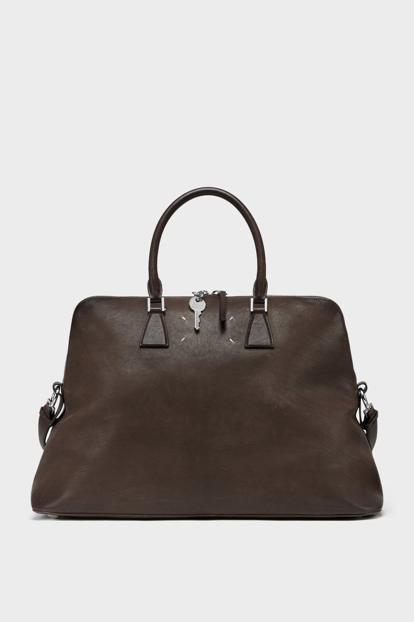 5ACラインの象徴的モデル XLは、メゾンの「アノニミティ・オブ・ザ・ライニング」を表現したアイテム。手作業でウォッシュ・ワックス加工が施されたレザーは、時の経過を思わせる風合いを宿します。構築的なラインと上品な金具、露出したトップジップが輪郭を際立たせます。トップハンドル付きで実用性も備え、ナンバリングアートワークと4本の白いステッチがメゾンの美学を象徴します