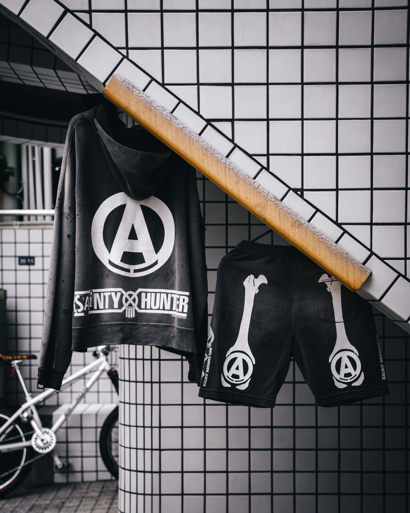 フロント・バックにアナーキーマークとボーンモチーフのプリントを施した