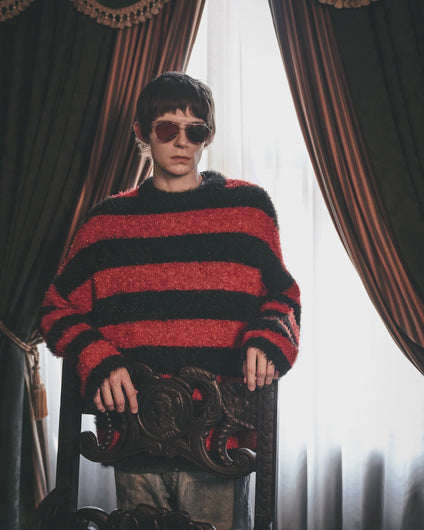 グリッター糸を織り交ぜて編み上げたクルーネックボーダーのセーターです。