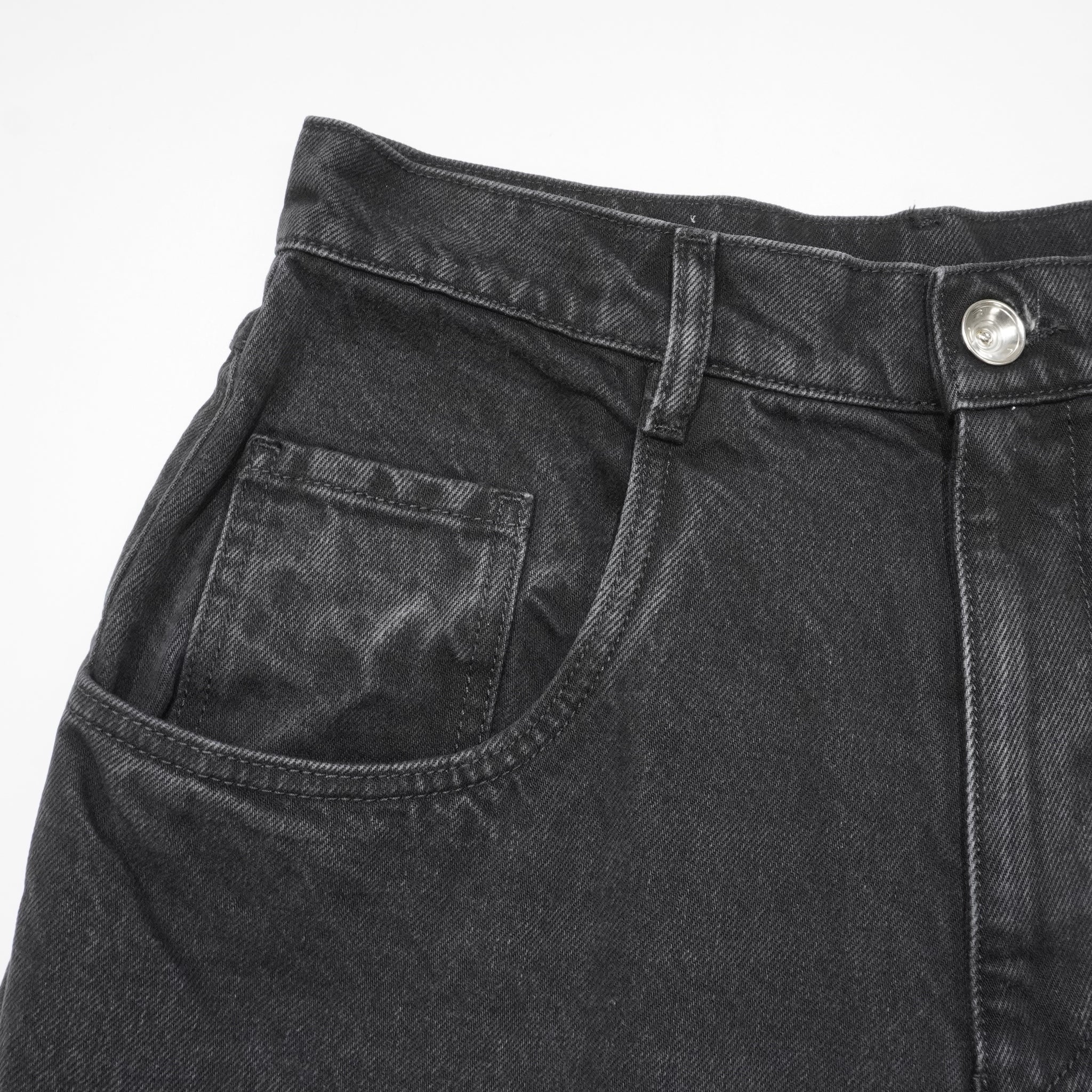 切りっぱなしの太もも、5ポケットのスタイリング、ベルトループが特徴です。