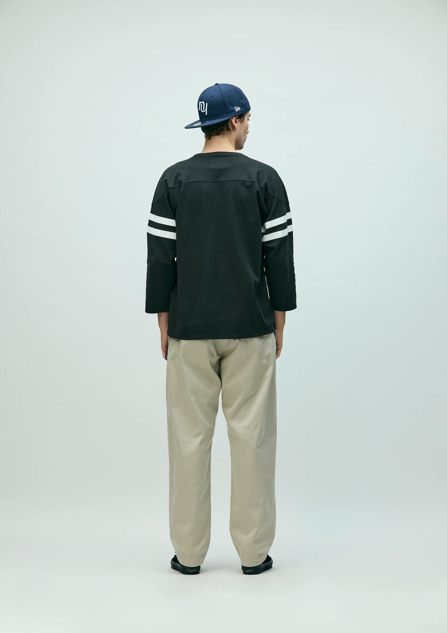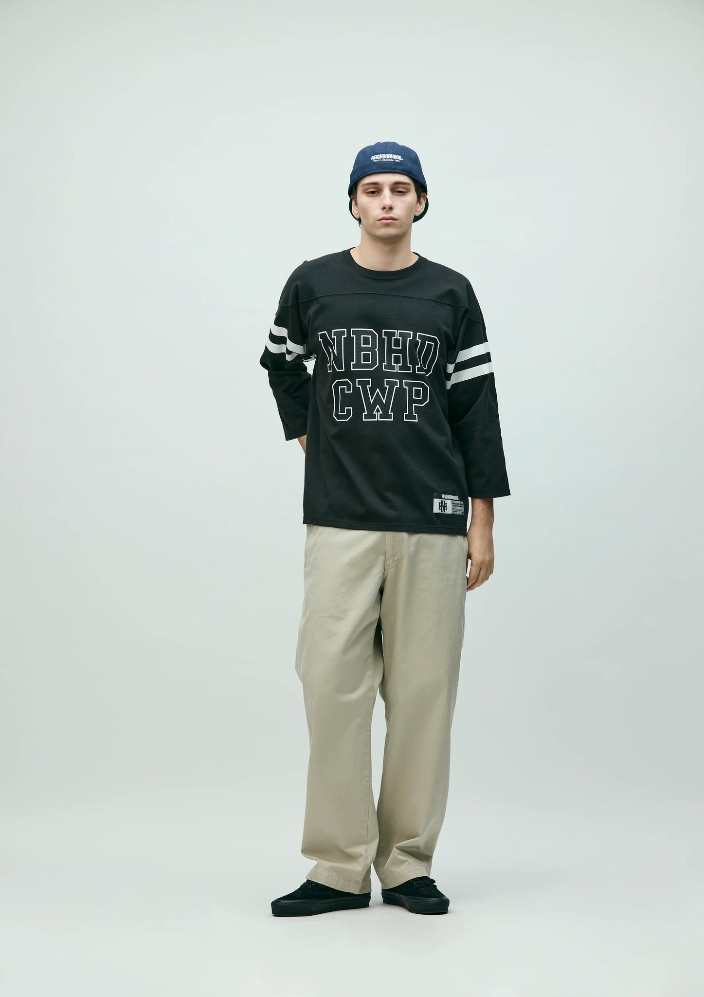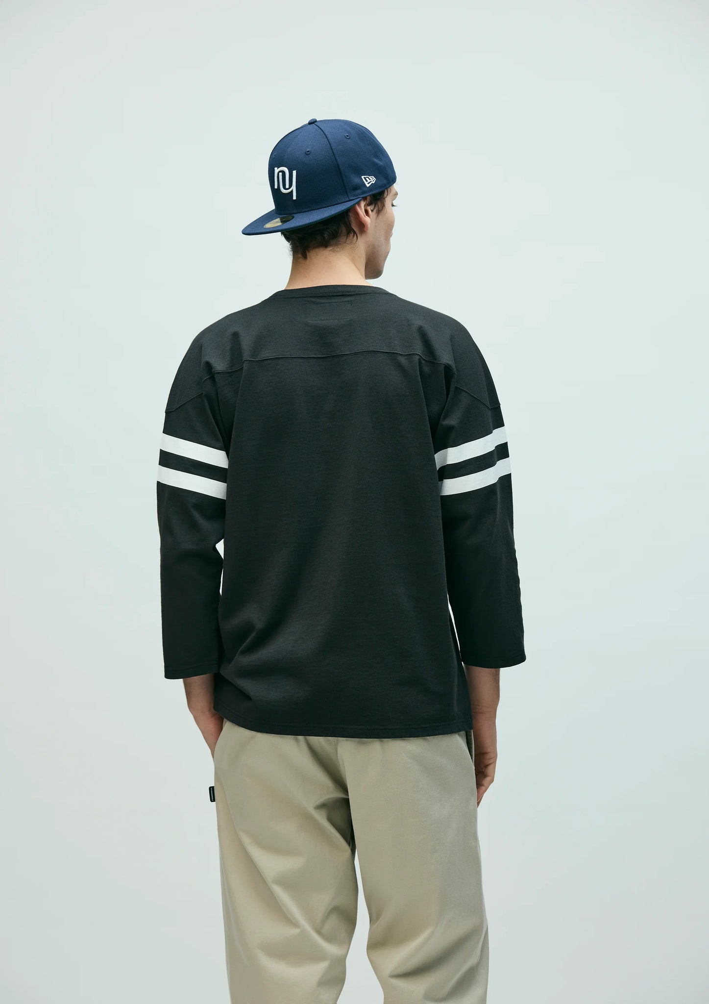袖にラインプリントを配置。左裾にブランドタグ、
