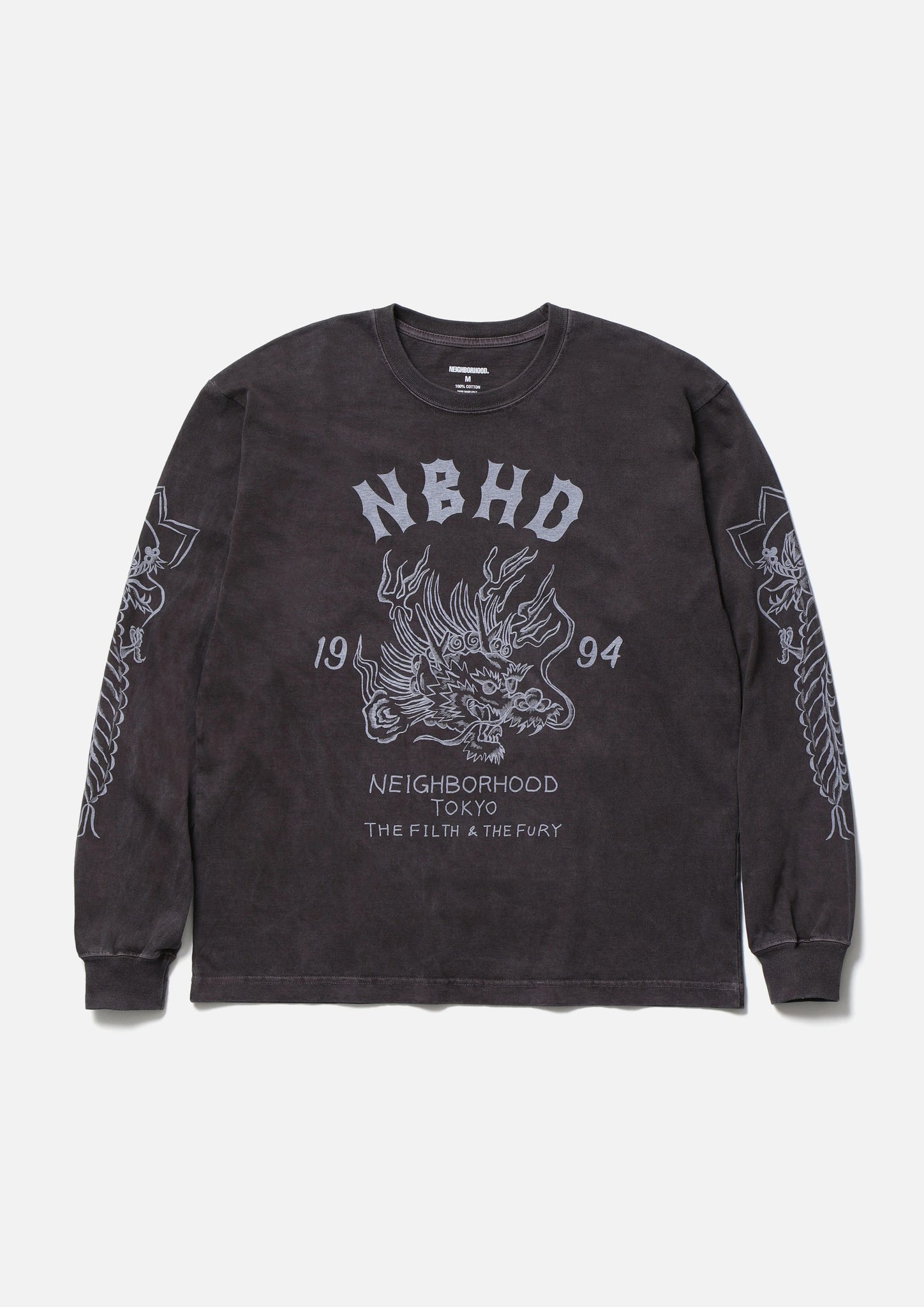 コットン天竺のオリジナルボディーをベースに、顔料染め加工を施したロングスリーブTシャツ。正面、背面、袖にグラフィックをプリント。ワンウォッシュ。