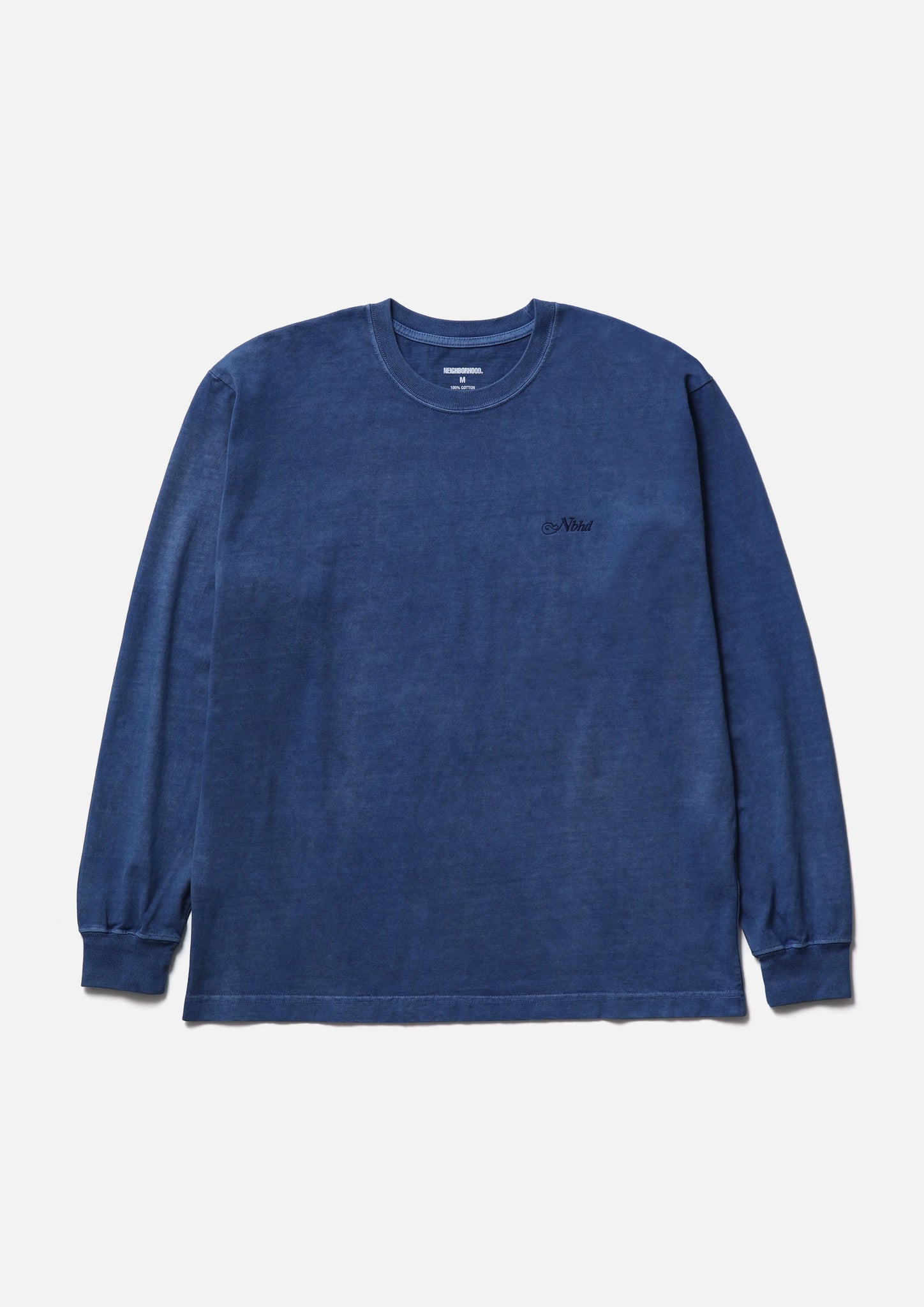 コットン天竺のオリジナルボディーをベースに、顔料染め加工を施したロングスリーブTシャツ。左胸にロゴを刺繍。ワンウォッシュ。