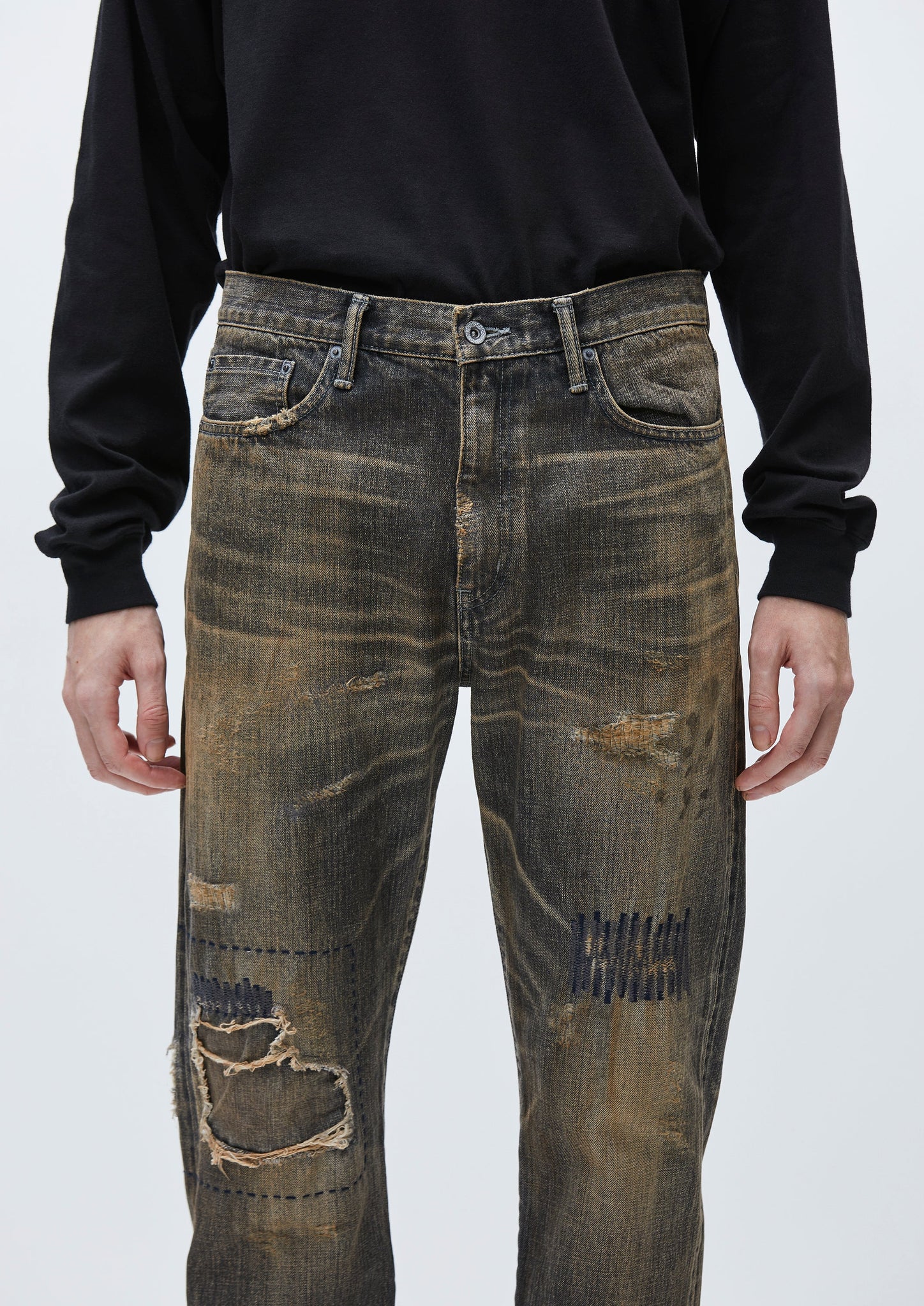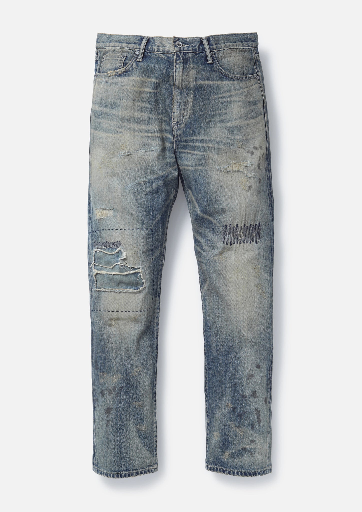多様なエイジング加工を施したサベージデニムパンツ。