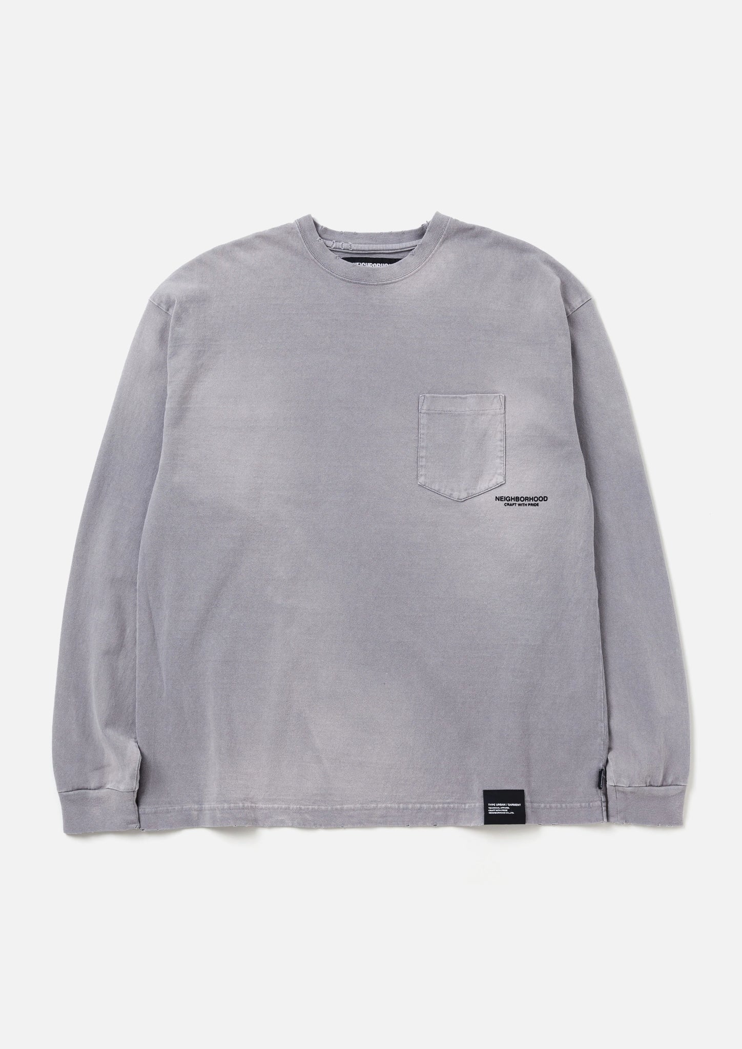 ポケット付きのクルーネックカットソー。複合加工を用いてリアルなエイジングを表現。