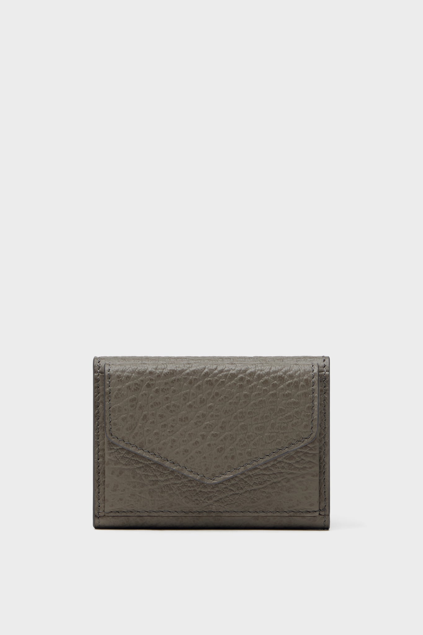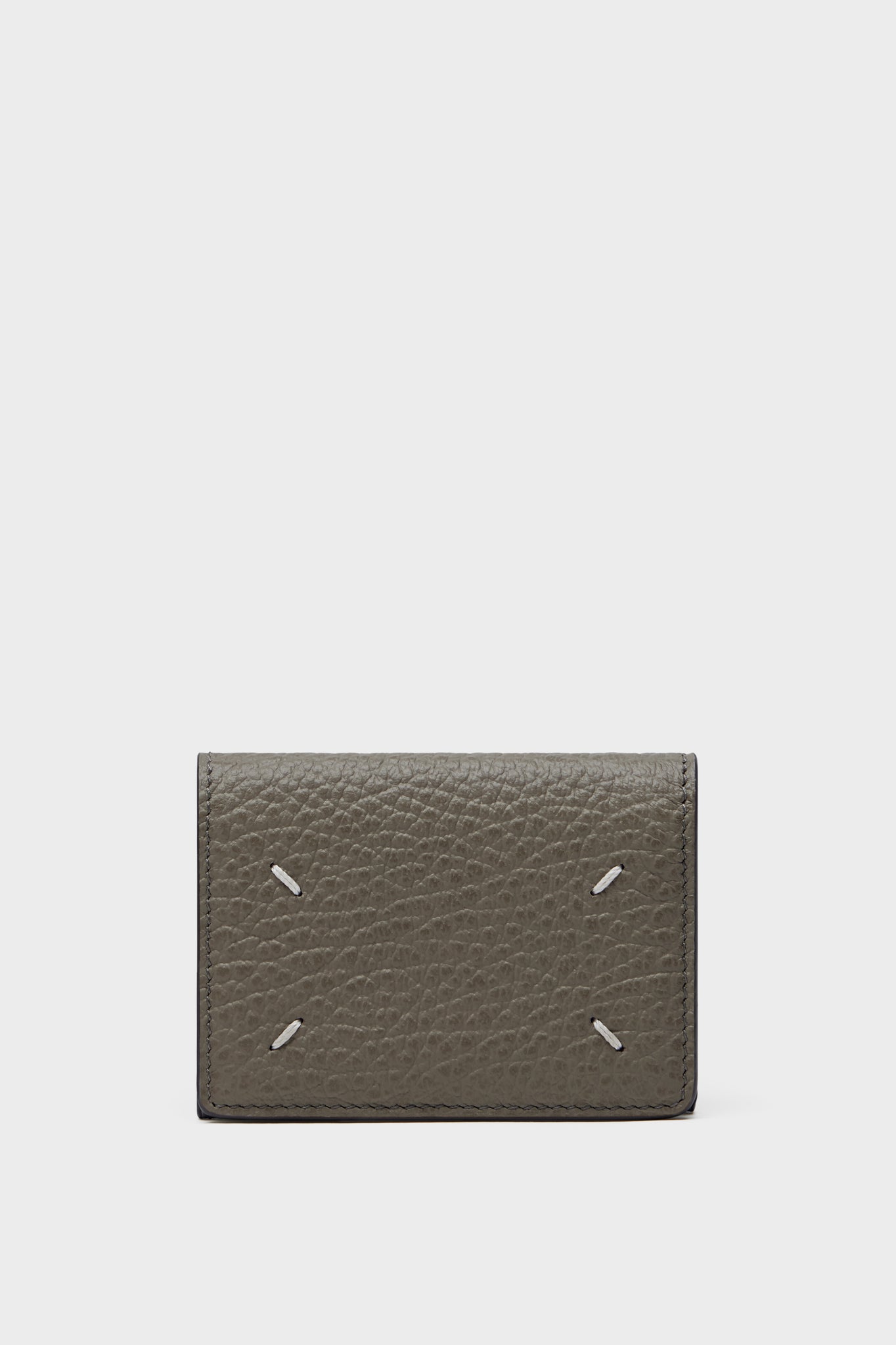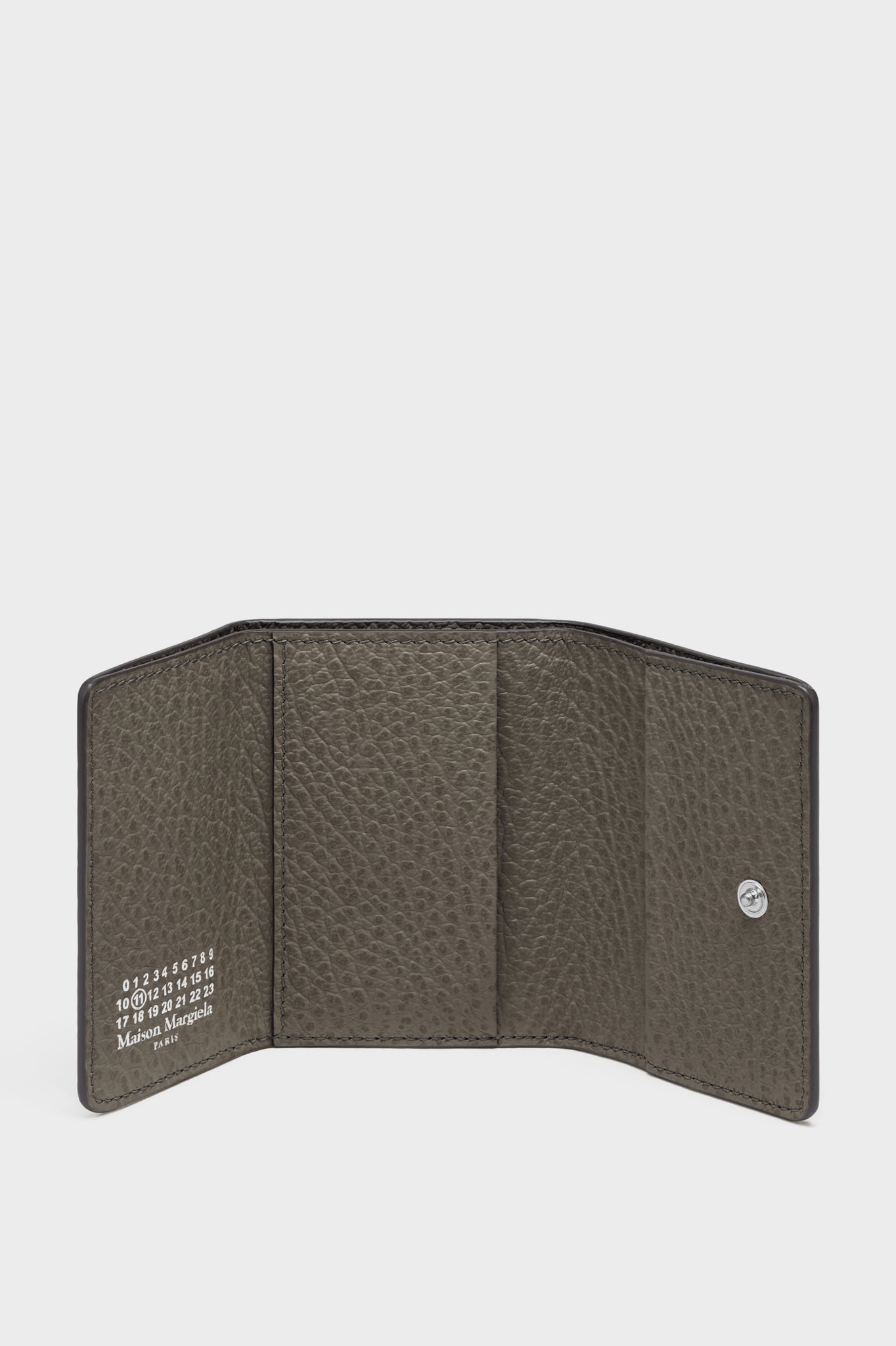エンボス加工が施されたグレイニーレザー製の三つ折り ウォレットです。エンベロープポケットとスナップボタンクロージャーが付いています。内側にはナンバリングロゴがあしらわれています。バックには、通常のファッションブランドのラベルとは対照的なメゾン マルジェラのシグネチャーの白い4ステッチがあしらわれています。
