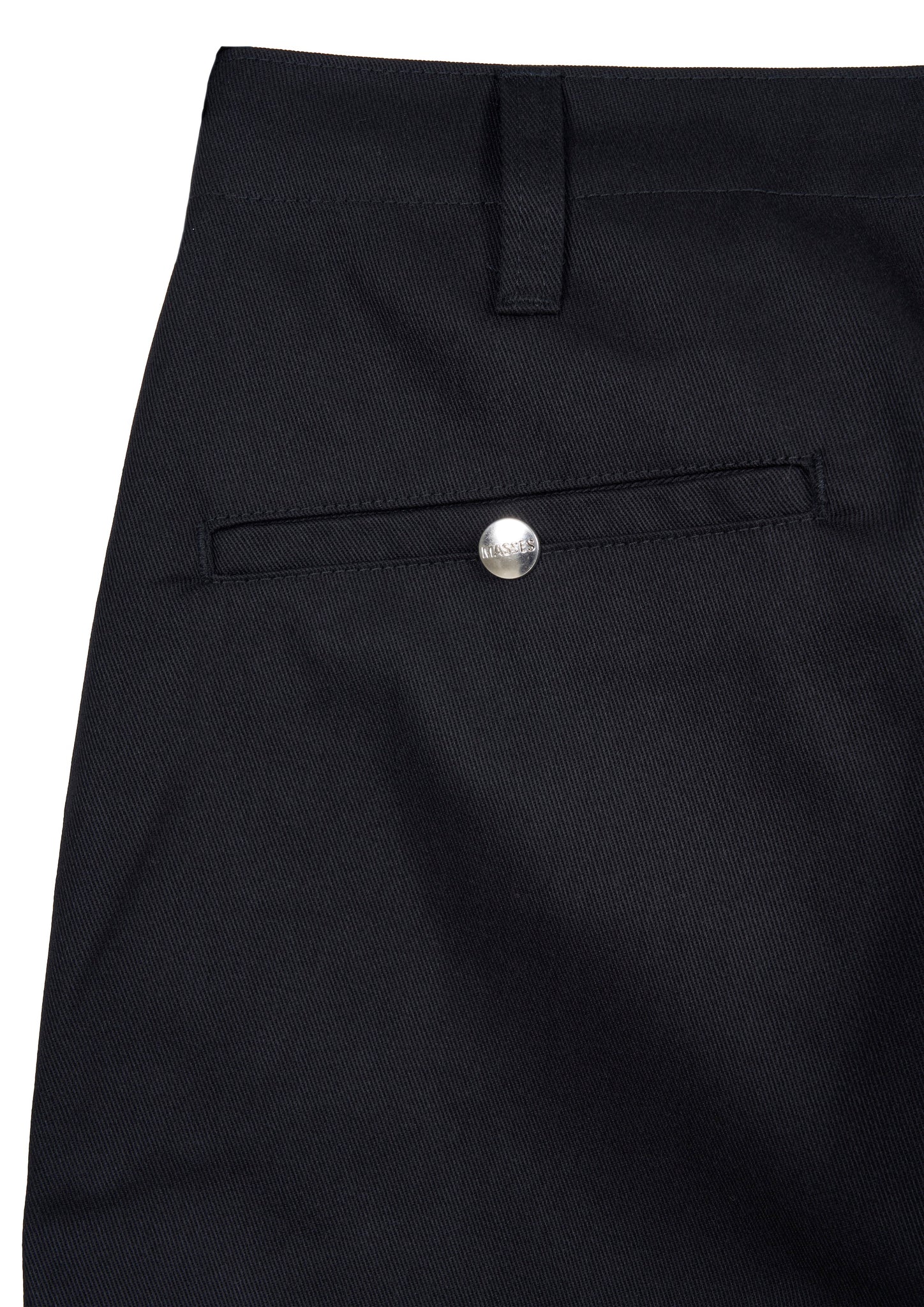 フロントと左ヒップポケットにはMASSESロゴの刻印を施したスナップボタン、